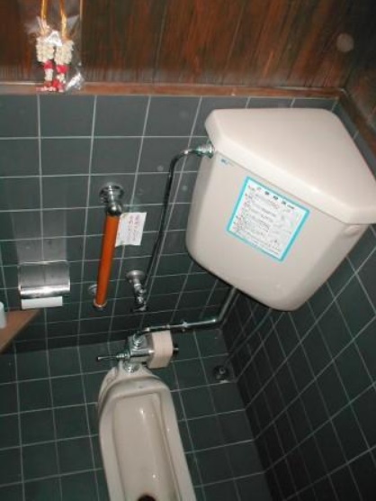 隅付けロータンクは撤去の予定ですが裏側の腰壁タイルに 大きな傷がなければ良いのですが外して見なければ最初は解りません。固定用の太いビス穴などのキズは多少出ますが