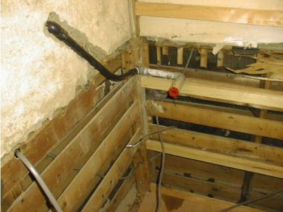 配管貫通の破損トラブル回避策が必要。違う見かたをすれば、こんな配管納まりが現実に有るので
