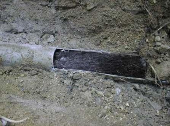 やはり周辺に植えてある樹木の根が汚水管に流れる養分に狙いをつけ 僅かな隙間から根を伸ばし入れて繁殖していた模様。配管継ぎ手の僅かな隙間から細い根の一本が入れば長い年月をかけ増殖し
